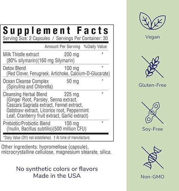 DIGESTIVE BALANCE = CLEANSING SUCCESS. We added milk thistle extract to her own Cleanse capsules to help support your liver, plus a prebiotic/probiotic blend (500 million CFUs) to aid in healthy digestion. Better digestion equals less toxin buildup, for a healthier you.
