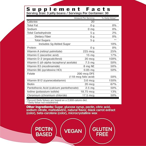 PACKED WITH VITAMINS & MINERALS. Containing vitamins, A, C, D, E, B3, B6, B12 and minerals like folate, chromium and iodine, VitaDrops Multivitamin Jelly Beans are essential for your supporting well-being, energy, vitality, immunity, and overall health.
