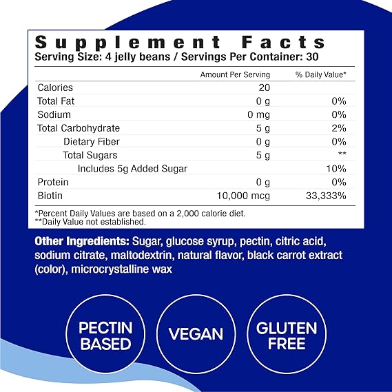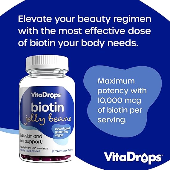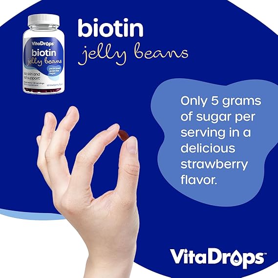 GREAT TASTE, GREAT BENEFITS. VitaDrops Biotin Jelly Beans are convenient to use and delicious to eat. And just think how healthy your hair, skin and nails will look after taking them! VitaDrops Biotin Jelly Beans provide 10,000 mcg of pure biotin per serving to support your healthy hair, vibrant skin, and strong nails.