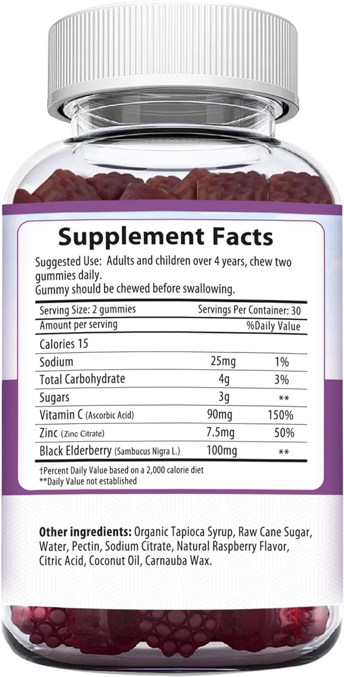 DOSE AND INGREDIENTS: Adults and kids 4 years and above should chew two gummies daily for optimal benefits. This supplement has a delicious kid-friendly raspberry flavor and contains vitamin C, Zinc and Black Elderberry extract.