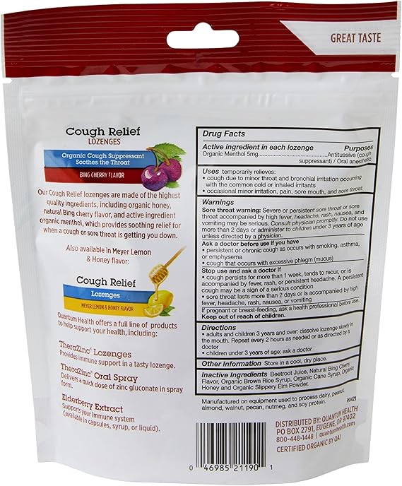 Quantum Health USDA Organic Cough Relief Lozenges|Bing Cherry|Natural Menthol Cough Suppressant|Soothes Sore Throat|USDA Organic|18 Count