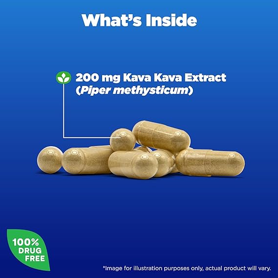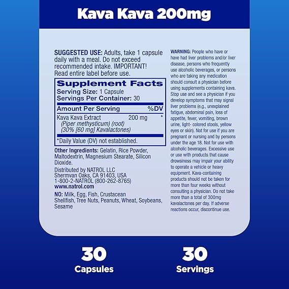 Mood and stress support supplement*: Contains one 30 count bottle of Natrol Mood & Stress Kava Kava 200mg capsules for a 15-30-day supply