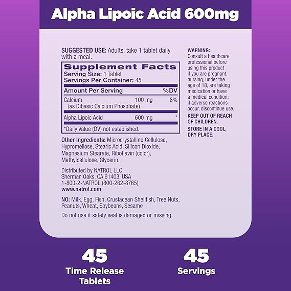 Alpha Lipoic Acid Supplement: One (1) 45 count bottle of Natrol Alpha Lipoic Acid 600 mg tablets for a 45-day supply