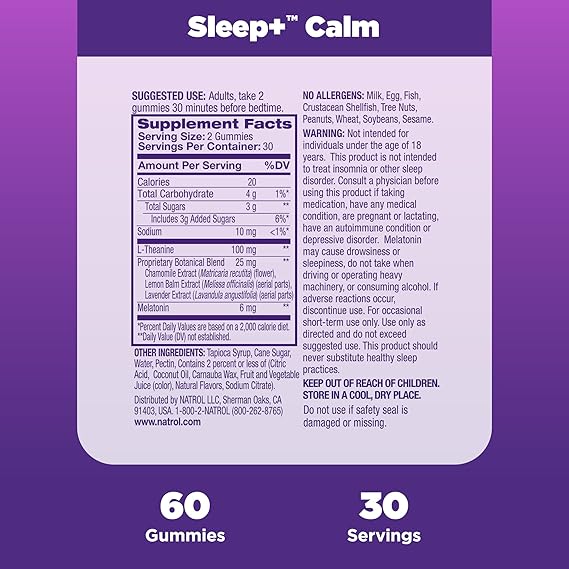 Clean Ingredients: Natrol Sleep+ Calm Gummies are 100% drug-free, non-GMO, gelatin-free, vegetarian, free of artificial flavors, sweeteners and synthetic dyes