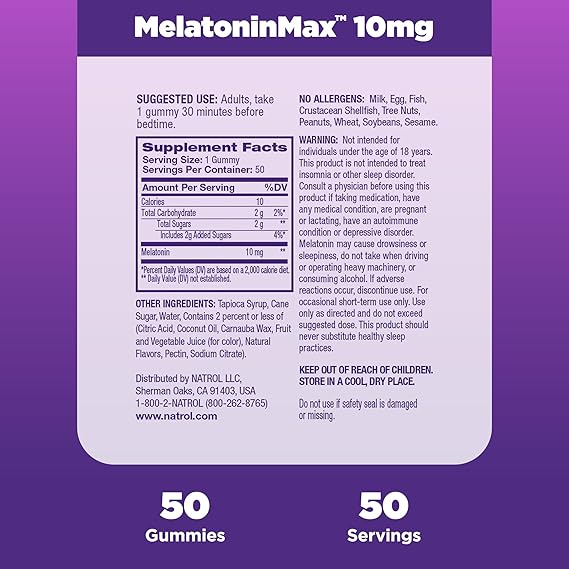 Clean Ingredients: Natrol Melatonin Max Gummies are vegetarian, gelatin-free and non-GMO; Free from artificial flavors, sweeteners, synthetic dyes or preservatives