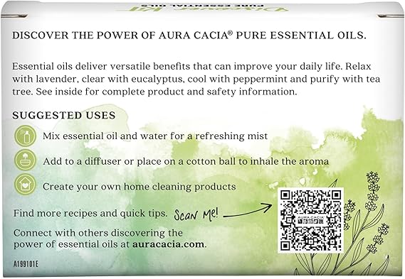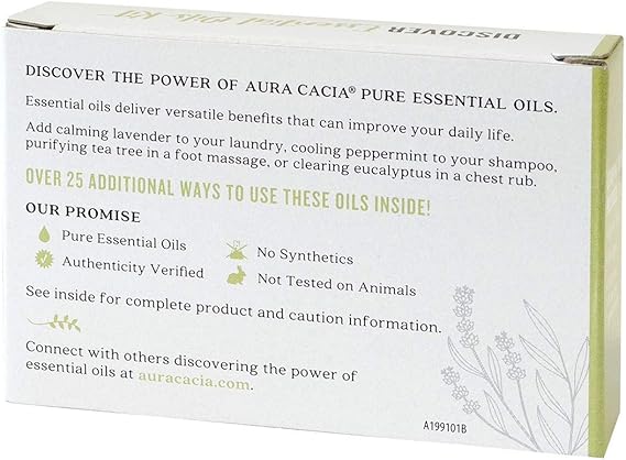 VERSATILE AND AROMATIC - Aura Cacia Discover Essential Oils Kit includes Aura Cacia Lavender Essential Oil, Aura Cacia Peppermint Essential Oil, Aura Cacia Eucalyptus Essential Oil and Aura Cacia Tea Tree Essential Oil. Each kit also includes a learning guide with quick tips, recipes, dilution rates and safety guidelines.
