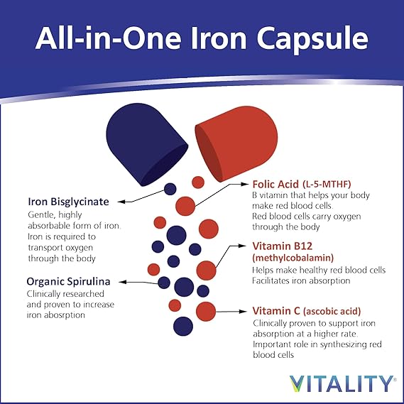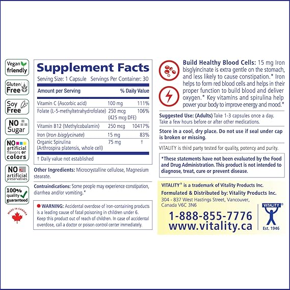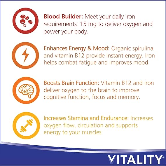 VITALITY Daily Iron + Organic Spirulina, 30 Veg Capsules | 15mg Iron | Blood Builder | Iron Deficiency Support | Vegan |All Natural Supplement | Gentle on Stomach