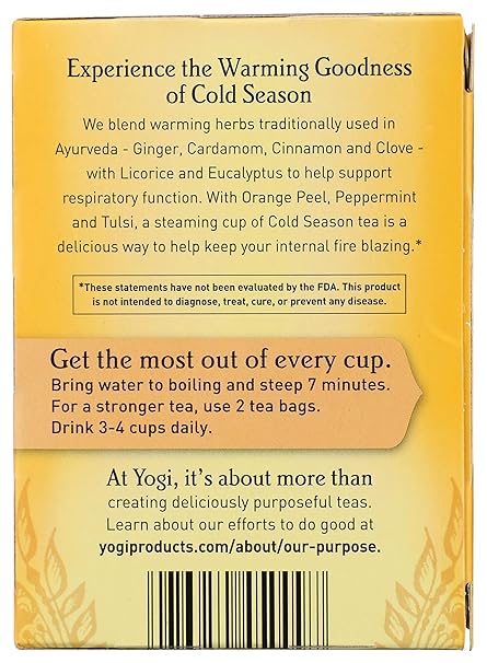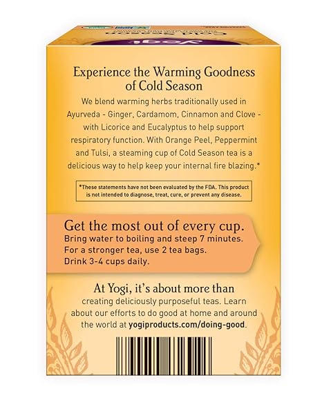 FLAVOR: Yogi Cold Season tea combines aromatic Eucalyptus and Peppermint with Licorice, Ginger, Cardamom, Cinnamon, and Clove for a naturally spicy-sweet herbal blend.