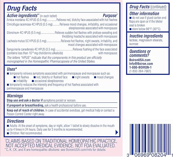 The tablets can help relieve profuse sweating, throbbing headache, and occasional sleeplessness associated with hot flashes. For best results, use daily for three months