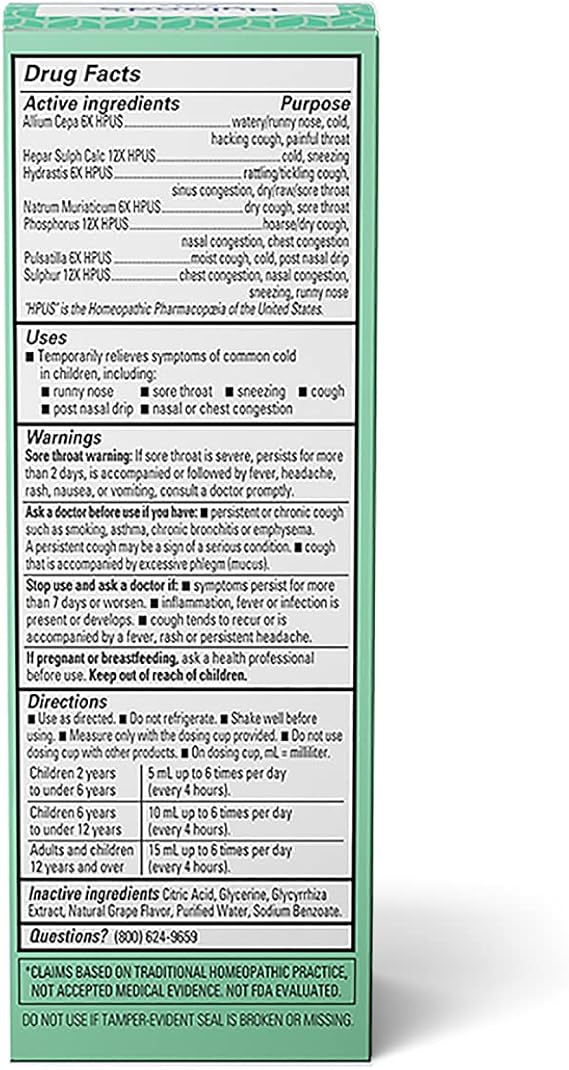 RELIEF OF COMMON COLD: Naturally relieves the symptoms of the common cold including nasal and chest congestion, runny nose, sore throat, sneezing and cough in children ages 2-12.
