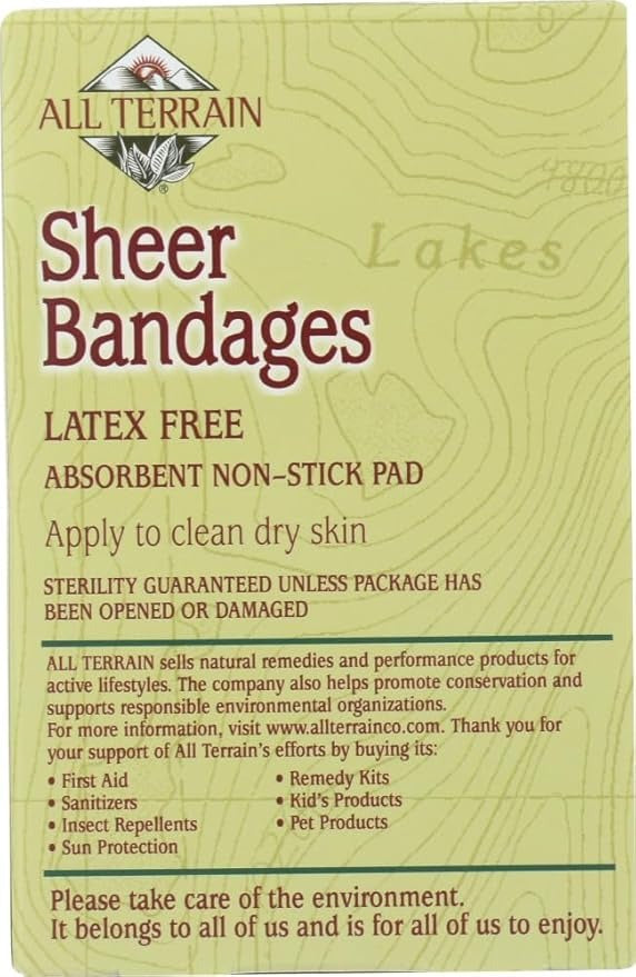 SHEER BANDAGES: All Terrain's latex-free & 100% sterile sheer bandages blend with your skin tone. They are absorbent non-stick pads and won't stick to your wound & won't irritate latex-sensitive skin.