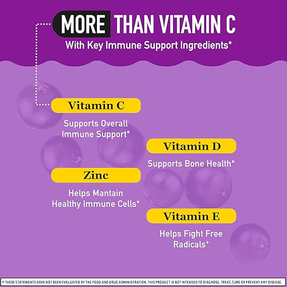 TASTY & CONVENIENT: These refreshing, Elderberry flavored, Vitamin C , Zinc gummies are convenient and easy for adults and for kids 4plus to take at home or on the go.