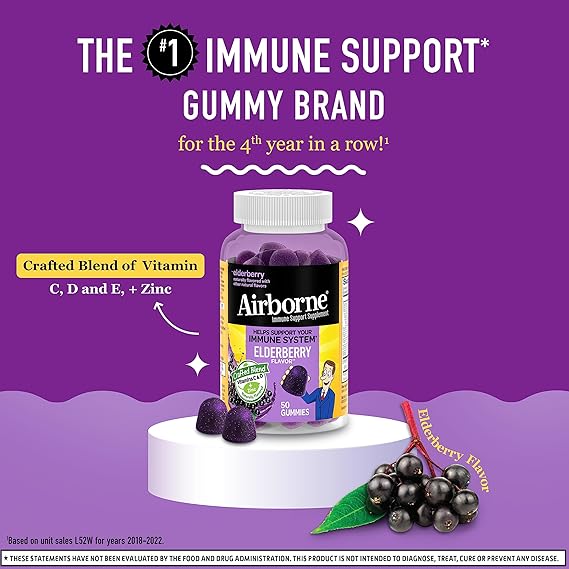 AIRBORNE ELDERBERRY , ZINC & VITAMIN C GUMMIES: This is a great tasting, Elderberry flavored, Vitamin C, D and Zinc immune support gummy.
