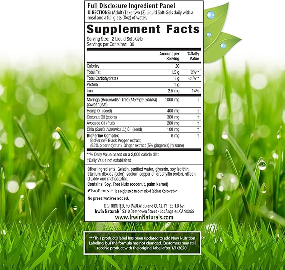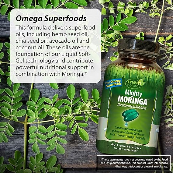 ADVANCED DELIVERY SYSTEM - These easy-to-swallow liquid soft-gels provide an optimum delivery system to release 1,000 mg of moringa and omega-3 fatty acids from fish oil fast without any added preservatives, binders or fillers.