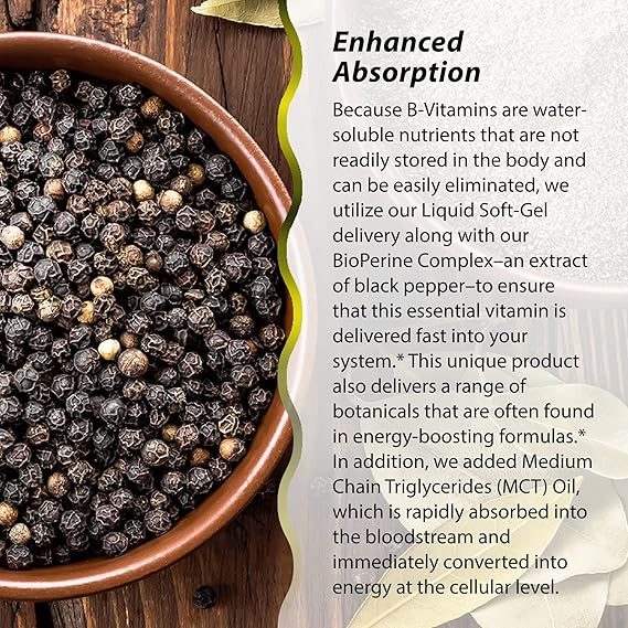 ADVANCED DELIVERY SYSTEM - Because B-Vitamins are water-soluble nutrients that are not readily stored in the body and can be easily eliminated, we utilize a liquid softgel delivery along with our BioPerine Complex, to ensure that this essential vitamin is delivered fast into your system without any added preservatives, binders or fillers. Our special BioPerine Complex enhances the bioavailability, absorption and potency of many nutrients.