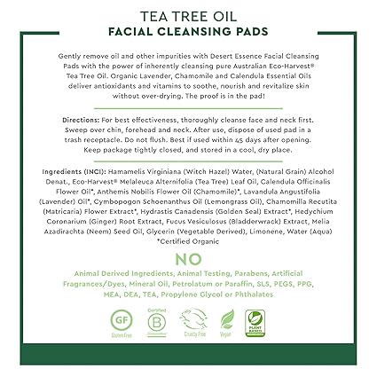 Desert Essence Daily Facial Cleansing Pads, 100 Count - Gluten Free, Vegan, Non-GMO Face Pads with Tea Tree Oil, Organic Lavender & Chamomile to Cleanse Skin, Reduce Oil & Dirt to Prevent Breakouts