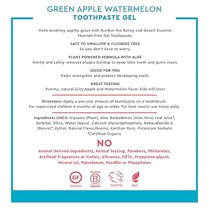Desert Essence, Green Apple Watermelon Toothpaste Kids Gel, 4.7 oz. - Safe to Swallow, Fluoride Free, SLS Free, Gluten-Free, Vegan, Plant Powered Formula, Great Tasting, Removes Plaque and Buildup