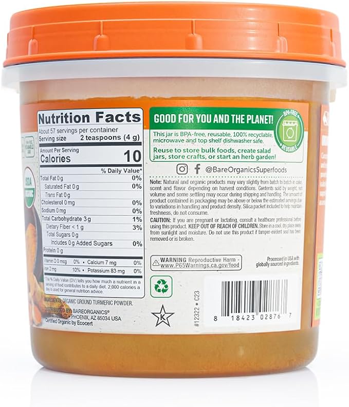 Quantity and Packaging: The organic dietary supplement weighs 8 ounces. Each jar of the superfood powder is 100% recyclable, BPA-Free and Reusable with an easy-peel label, and is both microwave and top shelf dishwasher safe.