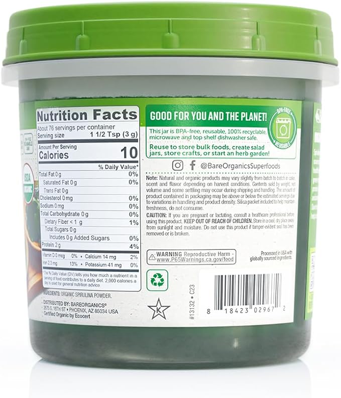Organic Spirulina Powder: Bare Organics believes in supplying simple and wholesome nutrition. Our USDA certified organic spirulina powder consists of vegan and gluten free ingredients. It is also non-GMO and has no added sugars or preservatives.