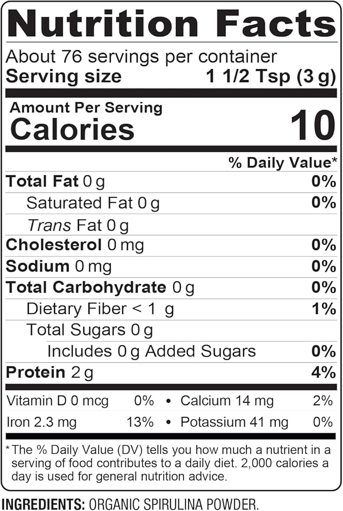 Natural Detoxifier: Our organic spirulina powder is a powerhouse of antioxidant properties. It is full of protein, chlorophyll, minerals, and vitamins which help reduce fatigue and boost your stamina.
