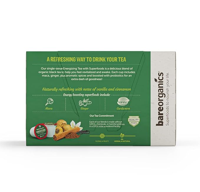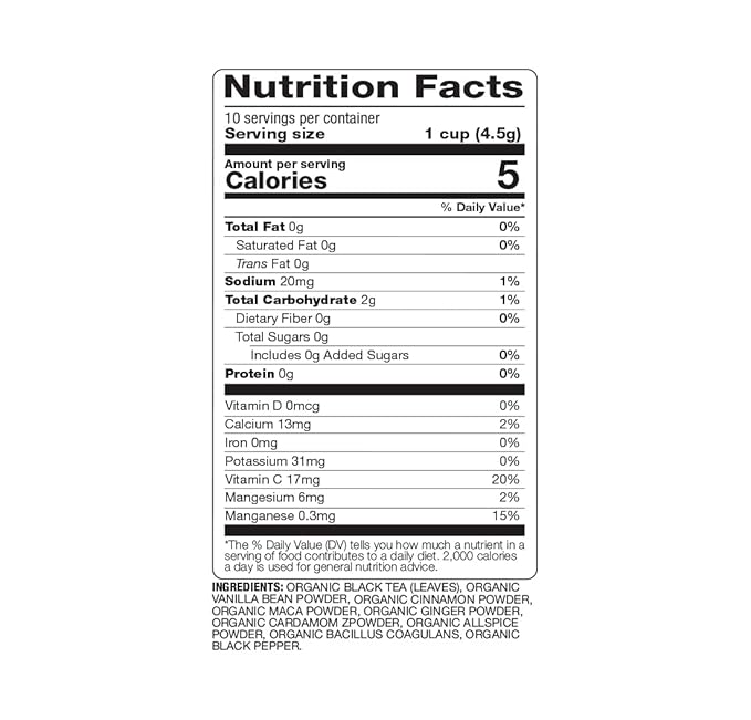 Ingredients: Organic Black Tea (Leaves), Organic Cinnamon Powder, Organic Maca Powder, Organic Ginger Powder, Organic Cardamom, Organic Vanilla Bean Powder, Bacillus Coagulans, Organic Allspice, Organic Black Pepper. 1 Billion Cfu At Time Of Manufacturing