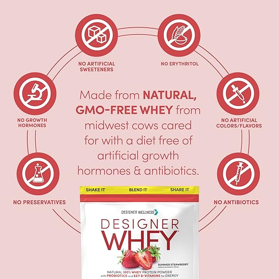 Designer Wellness, Designer Whey, Natural Whey Protein Powder with Probiotics, Fiber, and Key B-Vitamins for Energy, Gluten-Free, Summer Strawberry, 2 lb