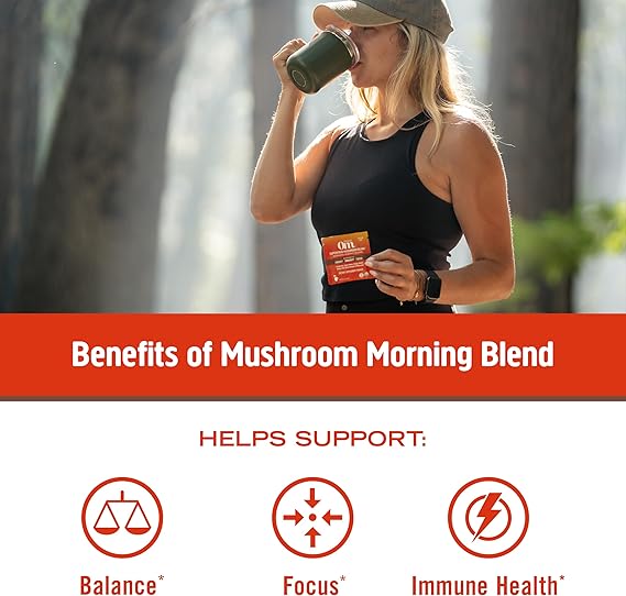 Om Mushroom Superfood Morning Energy Blend Mushroom Powder Drink: Contains 10 single servings of Natural Coffee-Free Energy Lift with Cordyceps, Vitamin D2, Lion's Mane with Rhodiola, Turkety Tail and King Trumpet, Reishi and Chaga for a coffee-free morning energy super blend of whole food functional mushrooms