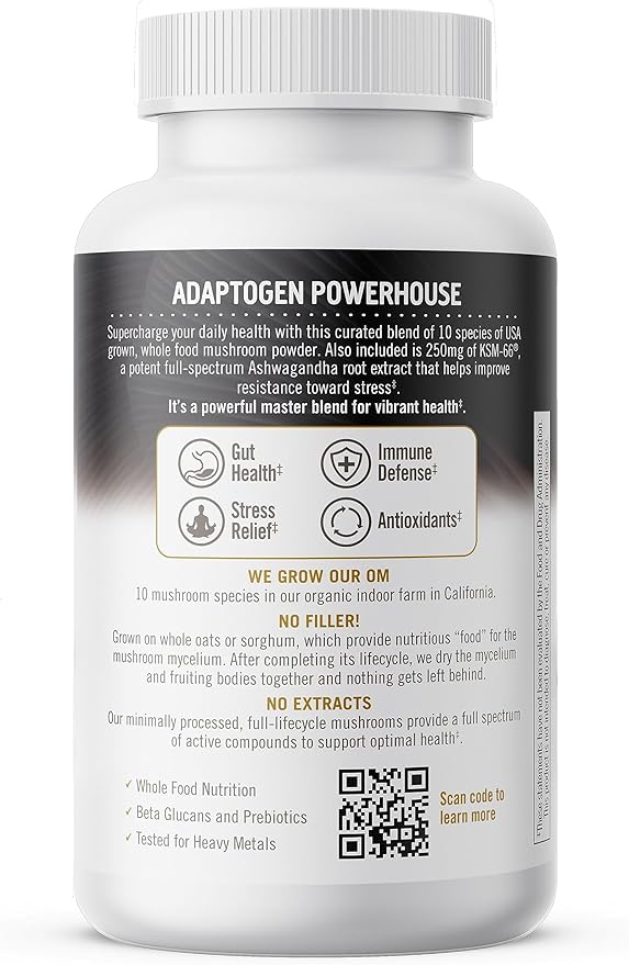 Om Mushroom Superfood Master Blend Mushrooms & Adaptogens, Capsules Supplement: Contains 80/84 capsules (20/28 servings, packaging may vary) of 10 species of USA grown, organic whole food mushrooms including Cordyceps, Reishi, Lion’s Mane, Turkey Tail, Chaga, and more. It’s a powerful master blend for vibrant health*