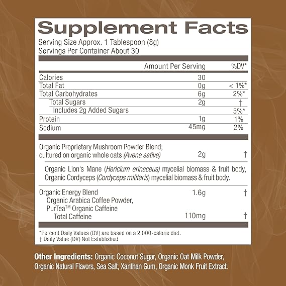 Organic Coffee Latte Blend Packed with Functional Mushrooms: Om Mushroom Coffee Latte features 30 servings of 100% Arabica organic coffee with less than 2 grams of sugar and is packed with organic Lion's Mane, Reishi, Cordyceps and Chaga superfood mushrooms