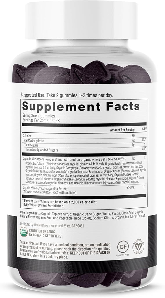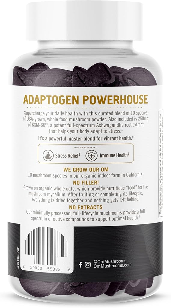 Om Mushroom Superfood Master Blend Mushroom Gummies: Contains 56 gummies (28 servings) of 10 species of USA grown, organic whole food mushrooms including Cordyceps, Reishi, Lion’s Mane, Turkey Tail, Chaga, and more. It’s a powerful master blend for vibrant health*