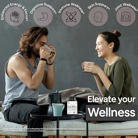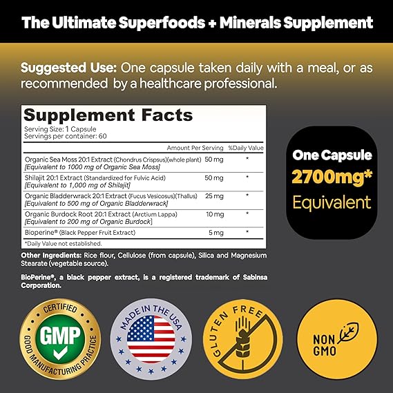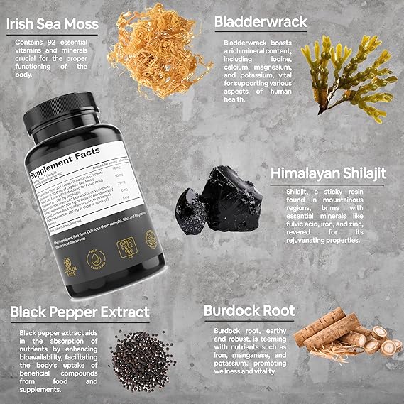 NUTRIENT-RICH INGREDIENTS: Each capsule delivers a potent blend: 1000 mg Sea Moss, 1000 mg Shilajit, 500 mg Bladderwrack, 200 mg Burdock Root, and 5 mg Black Pepper per serving. Together, these ingredients bolster immune health and promote natural bodily processes.
