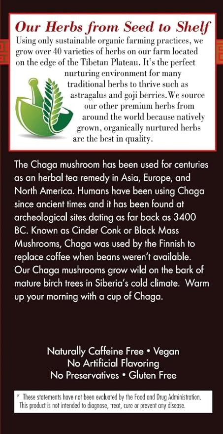 The Chaga mushroom has been used for centuries as an herbal tea remedy in Asia, Europe, and North America. Also known as Cinder Conk or Black Mass Mushrooms, Chaga was used by the Finnish to replace coffee when beans weren’t available. Warm up your morning with a cup of Chaga.