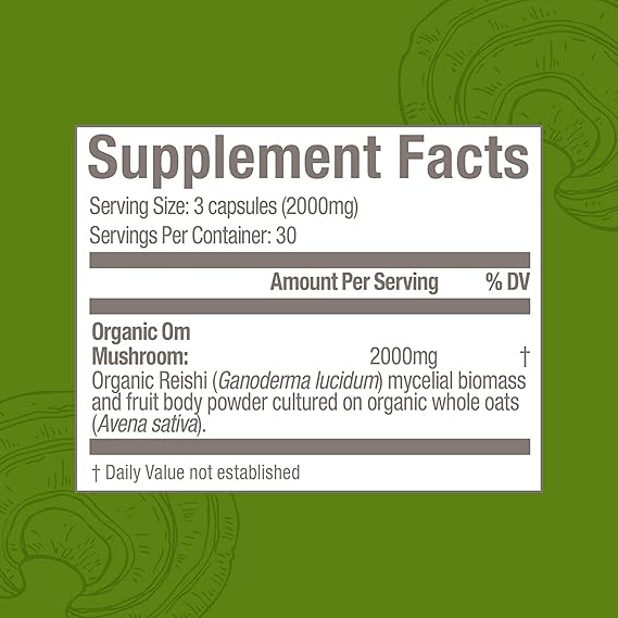 Om Mushroom Superfood Reishi Organic Mushroom Powder: Contains 90 capsules containing whole food mushroom powder, certified organic Reishi (Ganoderma lucidum) fruit body and mycelial biomass powder cultured on organic oats