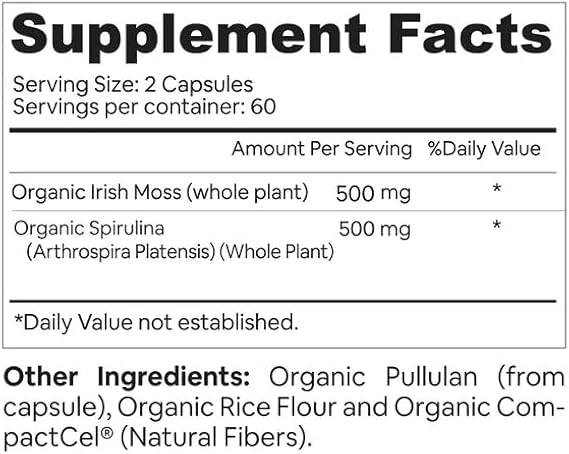 IRISH SEA MOSS WITH SPIRULINA CAPSULES: Experience the benefits of our carefully formulated capsules, featuring pure Irish Sea Moss and Spirulina. This unique blend offers a concentrated source of essential nutrients, known for promoting skin and gut health, and providing vital minerals for bodily functions.