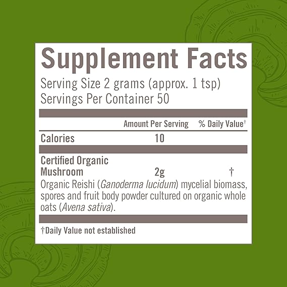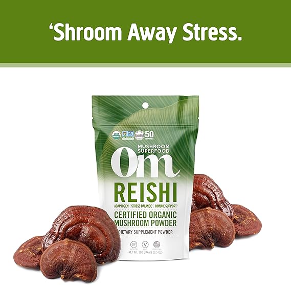 Om Mushroom Superfood Reishi Organic Mushroom Powder: Contains one 3.5 ounce pouch (50 Servings) of whole food mushroom powder, certified organic Reishi (Ganoderma lucidum) fruit body and mycelial biomass powder cultured on organic oats